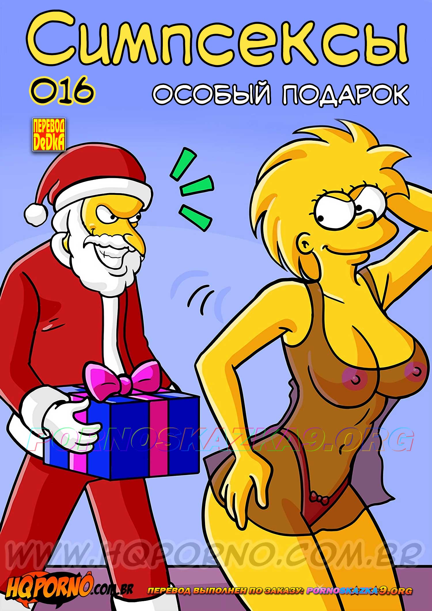 Порно комикс Симпсексы. Часть 16. Особый подарок. В канун празднования Рождества подлый начальник Гомера Чарльз Монтгомери Плантагенет Шикльгрубер Бернс оставил Гомера работать сверхурочно. Гомер пытался уговорить начальника отпустить его, потому что дома его уже ждут, на семейном праздновании Рождества Гомер должен был нарядиться Санта Клаусом и раздавать всем подарки. Но жестокий Бернс сказал, что он сам нарядится Санта Клаусом и выполнит эту работу вместо Гомера, а за эту услугу Гомер должен будет отработать бесплатно целый месяц…